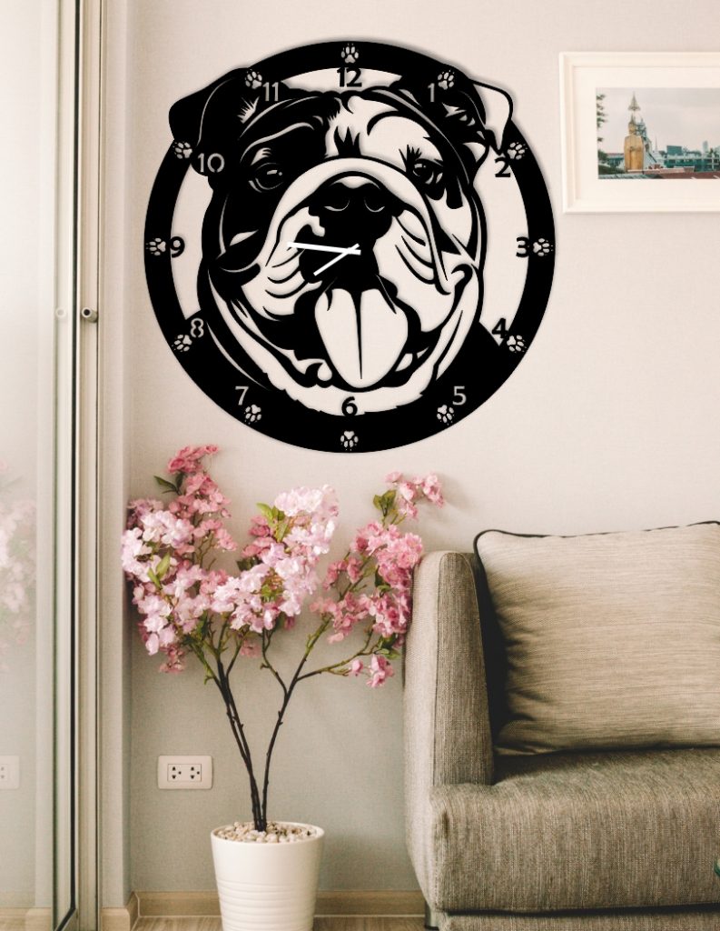 Zegar Buldog angielski wyposażony jest w cichy, całkowicie bezgłośny, płynący, kwarcowy mechanizm do zegara, o najwyższym standardzie jakości, oraz plastikowy wieszak zintegrowany z obudową.