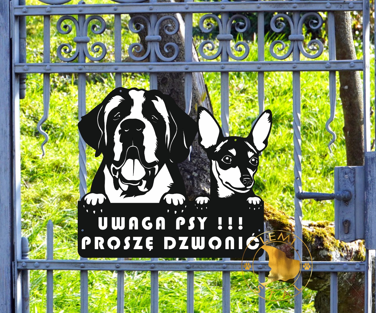 Tabliczka informująca o obecności na posesji psów – Bernardyna i Pinczera.