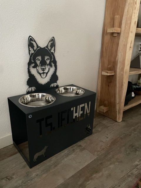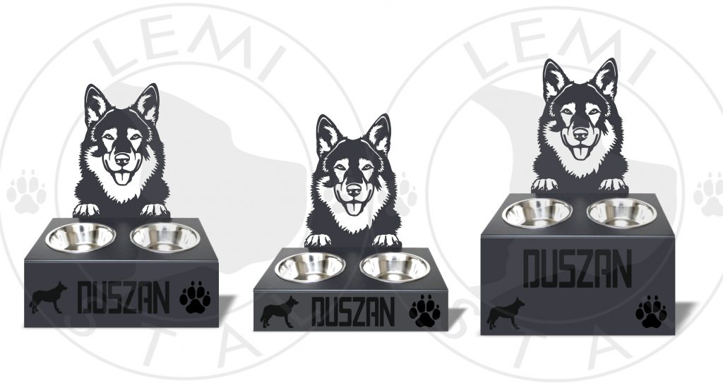 Stojak na miski na podwyższeniu został zaprojektowany dla dużych psów, zostanie precyzyjnie wycięty laserowo ze stali o grubości 2 mm (podstawa), 1,5 mm głowa i obustronnie pomalowany proszkowo trwałym lakierem stosowanym w branży motoryzacyjnej, o drobnej strukturze, odpornym na zarysowania oraz warunki atmosferyczne.
